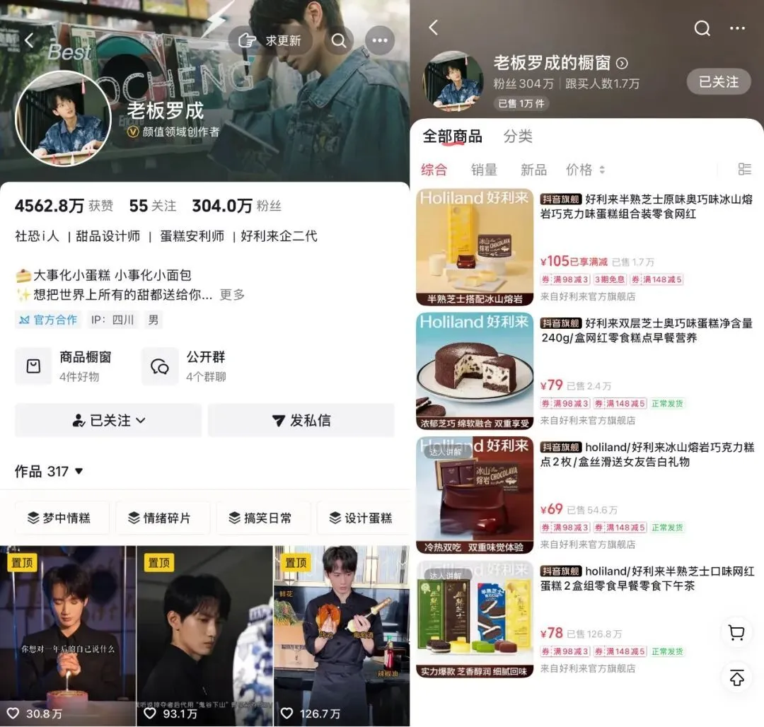 好利来二公子罗成的“社恐老板”人设,也为品牌带来了直接收益。其抖音橱窗中一款产品销量超过126万,按单价78元计算收入近亿元,即使在销售额中,博主贡献比例尚不明确,但是300万肩部网红账号的影响力不容小觑,IP对好利来扩大品牌声量和销量都有明显助力。
