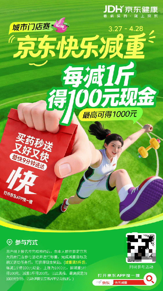 在“体重管理年”国家战略深入推进、全民健康意识持续提升的大背景下,京东健康于3月27日正式启动“快乐减重”活动,活动范围覆盖北京、上海、广州、深圳、天津五大城市。活动开启以来,报名人数已逼近百万。此次活动以“每减1斤得100元”激励为切入点,依托京东健康覆盖“医+检+诊+药”的闭环服务体系,为用户构建了一站式科学减重解决方案,正推动全民体重管理从理念走向可触达、可执行的日常行动。