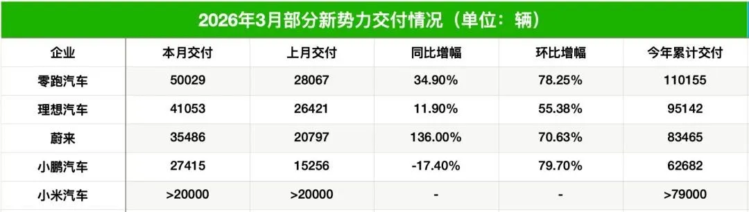 新势力3月成绩单出炉:零跑稳居头名,理想破4万辆,小鹏、小米激战“2万+俱乐部”